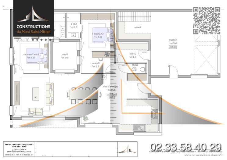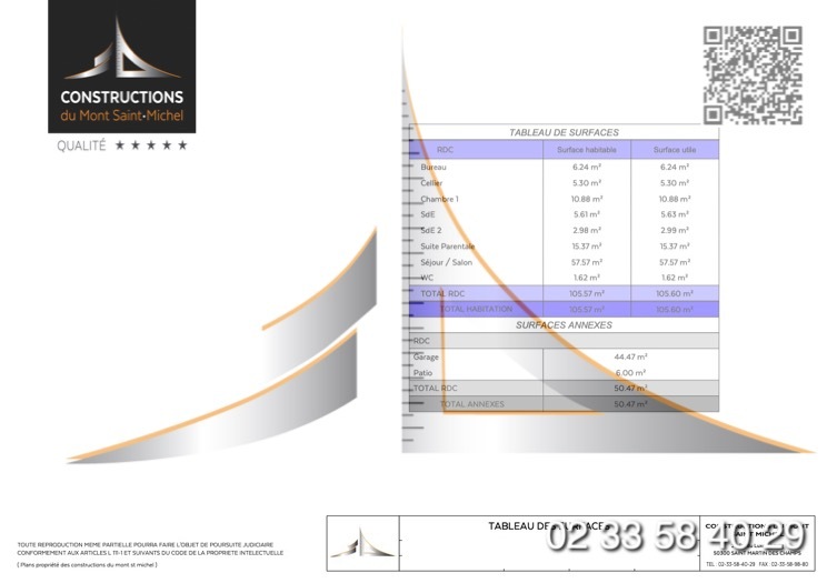Jullouville à 450 m du centre, projet de maison neuve composé d'un très grand volume de vie, suite parentale, chambre d'amie avec salle d'eau privative, bureau, cellier, grand garage, très grand grenier. chauffage plancher chauffant, maison en brique, menuiseries en aluminium volet roulant électrique, domotique.