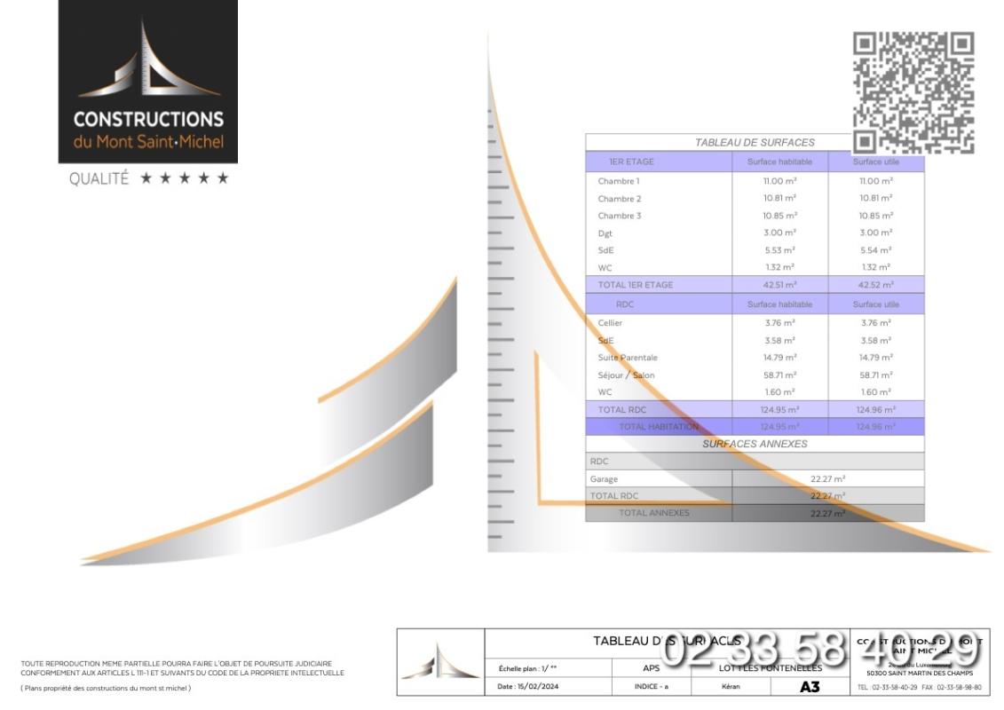 Carolles centre, sur terrain de 534 m2, Projet de maison neuve aux normes RE 2020, Rez de chaussée : garage, cellier, salle d'eau, suite parentale, séjour salon de 60m2 et wc, à l'étage 3 chambres, salle d'eau et wc séparé. chauffage plancher chauffant par aérothermie, menuiseries aluminium avec centralisation, domotique.