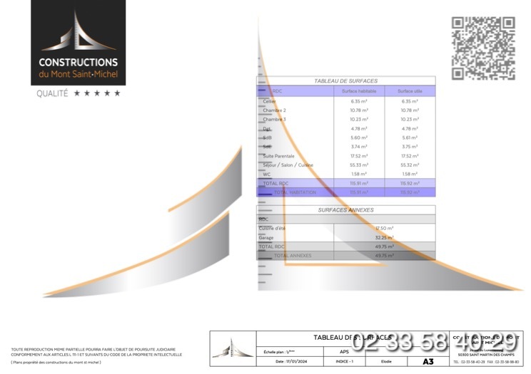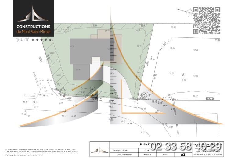 Carolles, projet de maison neuve en plain pieds sur terrain de 1200m2, trois chambres, une salle de bain et une salle d'eau, grande pièce de vie avec cuisine américaine avec ilot central, célier, double garage, cuisine d'été. maison en brique chauffage aérothermie avec plancher chauffant, menuiserie en aluminium et volet roulant électrique. Domotique et conformité RE 2020.