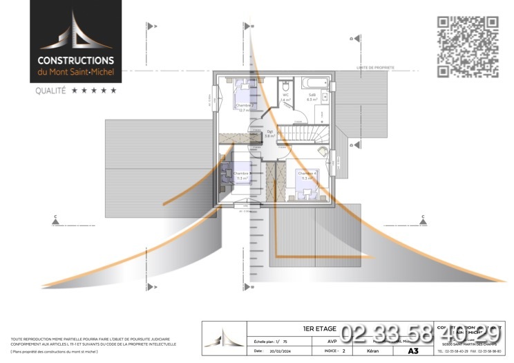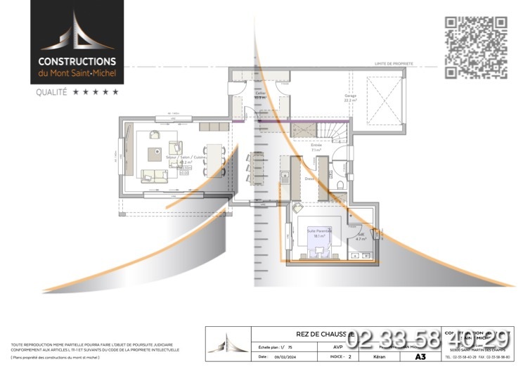 Exemple de projet de maison neuve sur un terrain de 567m2 à proximité du centre ville de jullouville, Vie de plain pied et 3 chambres et salle d'eau à l'étage. Suite parentale dans partie indépendante, cellier et garage.
